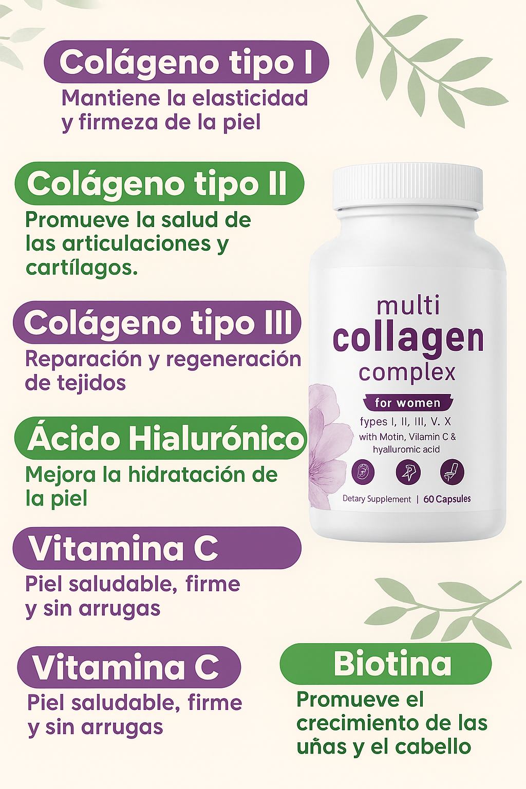 Presentamos Multi Collagen en Cápsulas, una fórmula poderosa y práctica que combina 8 tipos de colágeno en una sola cápsula para nutrir profundamente tu piel, cabello, uñas, articulaciones y hasta tu digestión. Todo sin batidos ni sabores extraños — solo 3 cápsulas al día, donde quieras y cuando quieras.
